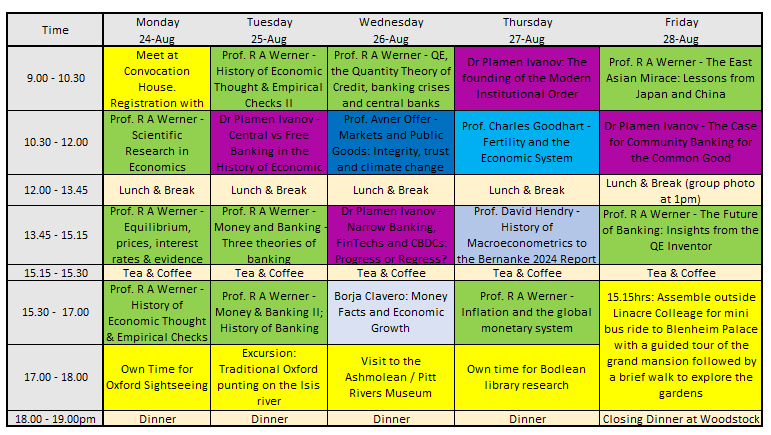 We are pleased to introduce you personally to a leading group of experts who will present and engage with you on the programme during the week. Expert presenters include the known economic historian Professor Avner Offer,Chichele Professor in Economic History, All Souls College, University of Oxford, the most famous monetary economist of the past half-century, Professor Charles Goodhart (LSE), founding member of the Bank of England’s Monetary Policy Committee and a leading central bank and monetary economics expert, Sir David Hendry,the world’s leading econometrician who pioneered the scientific “general to specific” methodology in econometrics and who is Professor Emeritus and Director at Nuffield College, University of Oxford. Furthermore, you will have ample opportunity to engage with Professor Richard A. Werner, Professor of Economics and Banking, who originally proposed a new monetary policy in 1995 called “Quantitative Easing” and who empirically proved that a bank creates new money when it extends a loan. Professor Werner is also known as a market forecaster and astute investment strategist and will analyse the present economic situation. Furthermore, participants will be able to meet a rising economic star, Dr Plamen Ivanov, Associate Professor at a number of universities with work on the varieties of capitalism. You will have the chance to meet these leading lights, discuss with them, benefit from their insights – and often join them for lunch or dinner during the Programme.